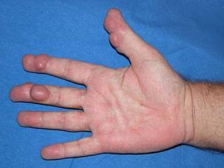 Typischerweise sind bei der rheumatoiden Arthritis kleine Gelenke betroffen, vor allem die Fingergrund- und -mittelgelenke (siehe Abbildung) sowie die Zehengrundgelenke. Prinzipiell kann aber auch jedes andere Gelenk von der chronischen Polyarthritis befallen werden. Sehr ungewöhnlich ist allerdings ein Befall der Fingerendgelenke.