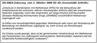 Neben dieser Zulassung zur Verbesserung der klinischen Symptome und Befunde bezieht sich der Zulassungstext in der Kombinationstherapie von Cimzia mit Methotrexat auch auf die Verlangsamung der Röntgenprogression sowie die Verbesserung der funktionellen Kapazität.