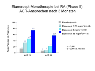 Klinische Studien mit Etanercept wurden 1992 begonnen. 1997 publizierte LW Moreland von der Universität Alabama, Birmingham, USA erste Ergebnisse einer kontrollierten Doppelblindstudie mit Etanercept in drei Dosierungen vs. Placebo. 180 Patienten mit langjähriger RA, bei denen mindestens ein DMARD nicht angesprochen hatte, wurden in die Studie aufgenommen und drei Monate lang mit Etanercept 0,25, 2,0 oder 16 mg pro Quadratmeter Körperoberfläche zweimal wöchentlich s. c. behandelt. Unter allen drei Dosierungen wurden signifikante, dosisabhängige Besserungen aller Parameter gesehen (Abb. 1).